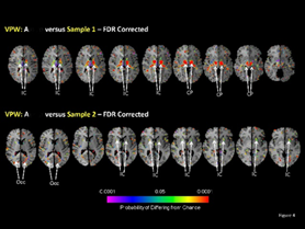 Diffusion Tensor Imaging (DTI) – measures the tendency for water to diffuse away from one location in the brain to another. Diffusion is constrained by numerous features of the local cellular environment in the brain, and it is therefore regarded as a measure of local tissue organization. One of the most frequently used DTI measures of tissue organization is termed “Fractional Anisotropy,” or FA. DTI analysis is performed by calculating the FA values for the patient and then comparing FA values at each point across the patient’s brain with FA values across the brains of healthy people.